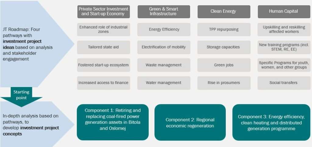 - Just transition support in line with the Just Transition Roadmap, adopted by the Government of the Republic of North Macedonia in June 2023, to ensure that the benefits of the green economy transition are shared, while protecting those whose jobs and livelihoods are affected by the coal phase out from falling behind.